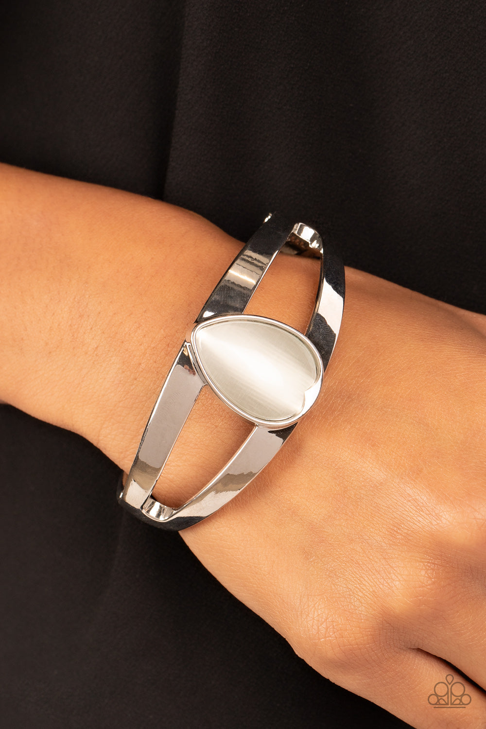 Encased in a sleek silver fitting, an oversized white cat's eye teardrop stone is pressed into the center of a layered bangle-like bracelet for an enchanting fashion. Features a hinged closure.