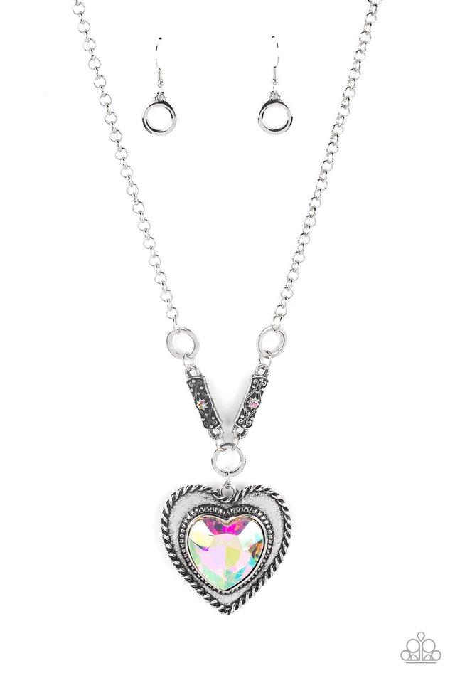 Bordered in spun silver ribbons, an oversized iridescent heart gem is pressed into a silver heart frame below the collar. The flirtatious pendant attaches to silver rings and decorative silver frames dotted in matching iridescent rhinestones, resulting in a dash of vintage inspired romance. Due to its prismatic palette, color may vary. Features an adjustable clasp closure.