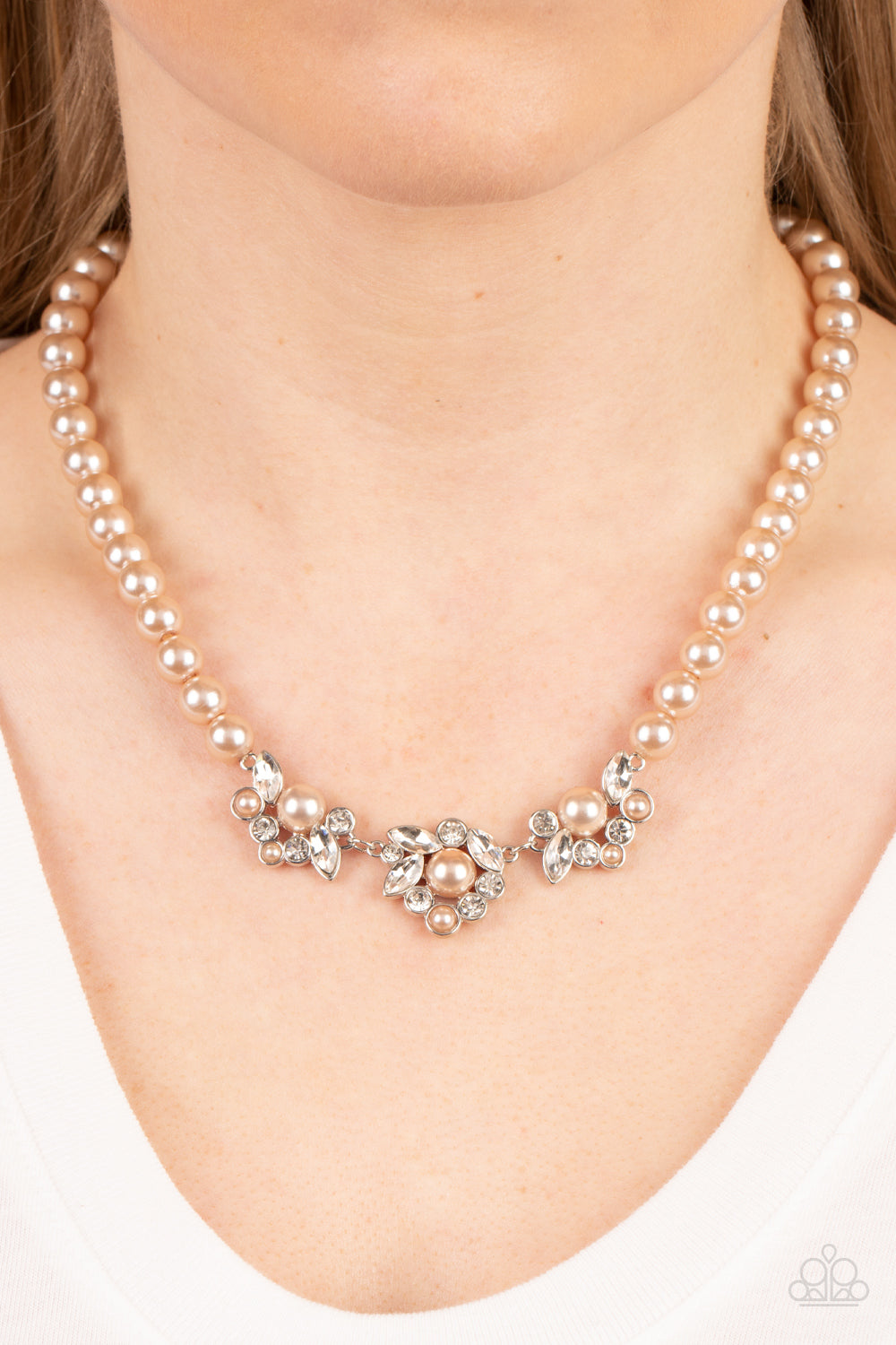 A bubbly collection of brown pearls, round rhinestones, and marquise cut rhinestones delicately cluster into effervescent frames at the center of a classic strand of brown pearls, resulting in a timeless centerpiece. Features an adjustable clasp closure.