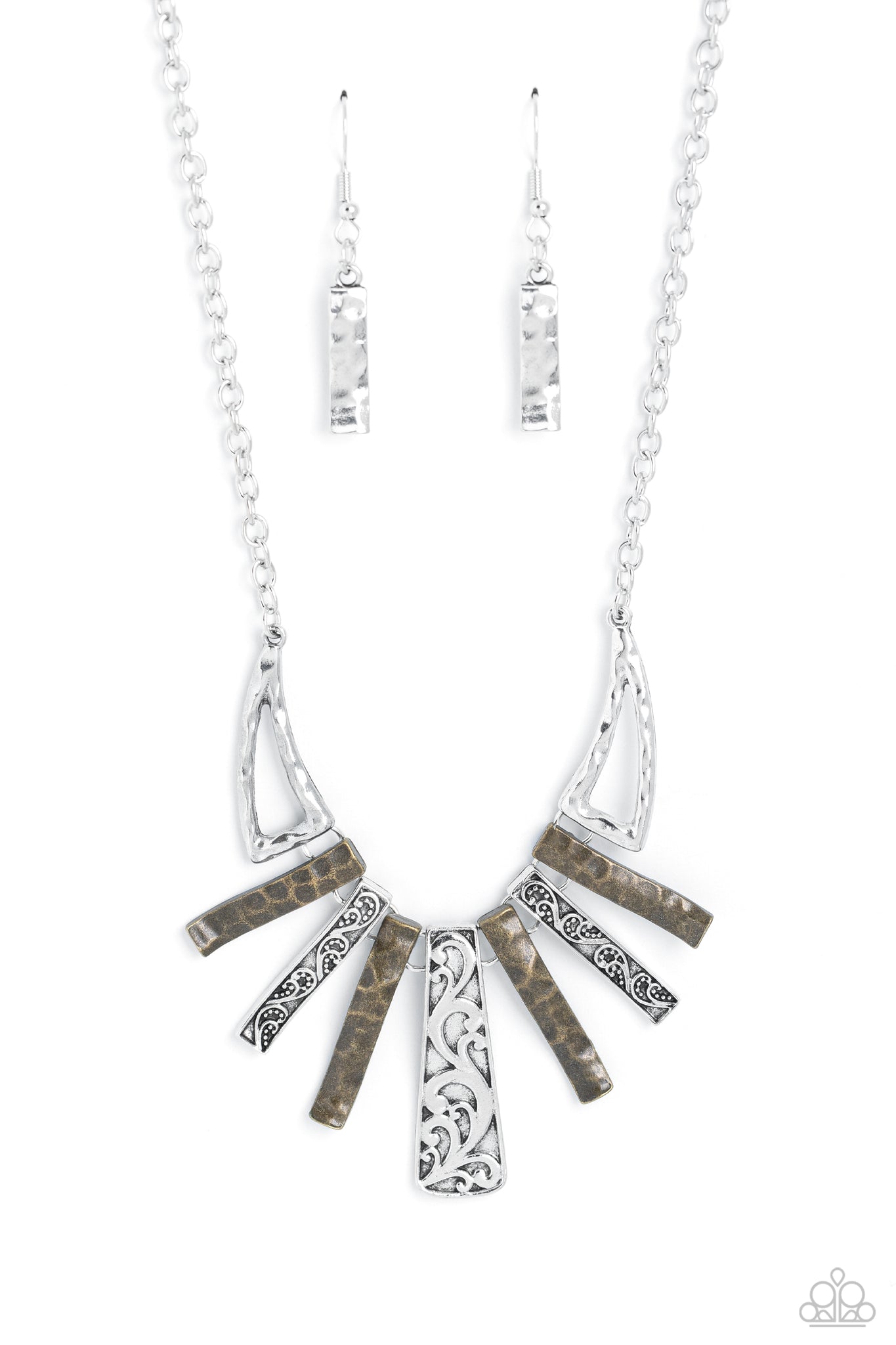Streaming from a glittery silver chain, warped brass bars with a hammered sheen alternate between warped silver bars featuring an embossed paisley pattern for a garden statement. Abstract triangles, in the same hammered silver sheen border the abstract bar display for additional attention-drawing detail down the neckline. Features an adjustable clasp closure.