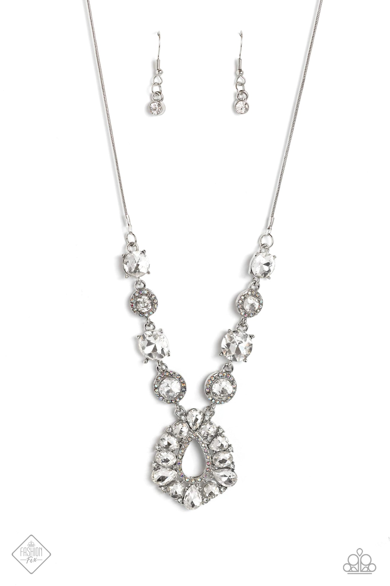 Cascading from a silver snake chain, oversized, round, white gems, encased in sleek silver fittings alternate with smaller round white gems pressed in a border of iridescent rhinestones for a refining pattern down the chest. A large teardrop pendant, surrounded by borders of white round and teardrop gems and dainty iridescent sparkle swings from the center of the alternating design, creating a glamorous statement. Features an adjustable clasp closure. Due to its prismatic palette, color may vary.