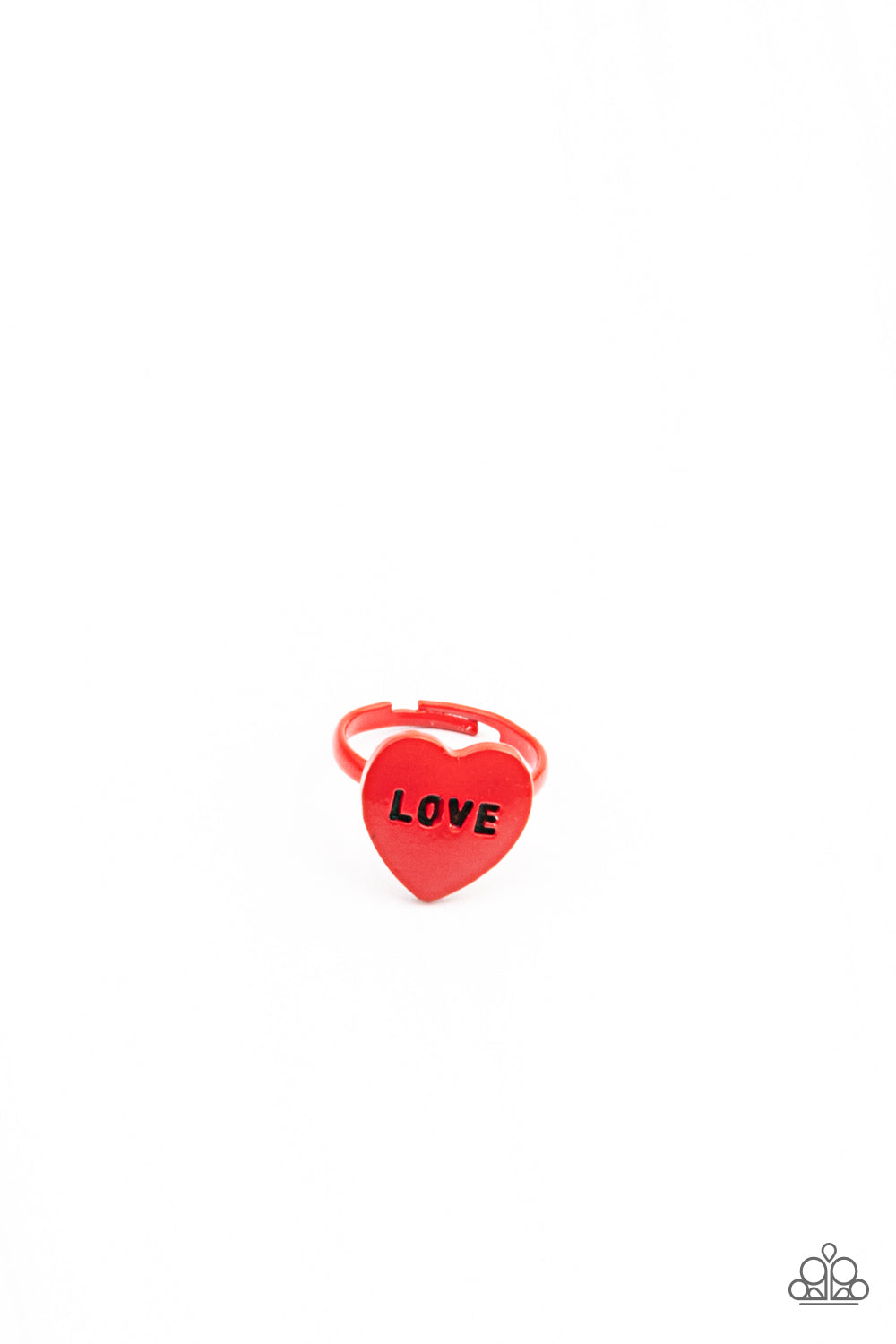 Five rings in assorted colors and shapes. Stamped in the word, "love," the flirty Valentine's day inspired rings vary in shades of dark pink, light pink, red, and white.